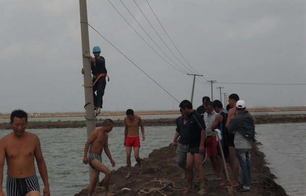 8月2日21時30分,“達維”在鹽城陳家港鎮(zhèn)登陸,帶來狂風暴雨。所轄供電范圍比鄰陳家港鎮(zhèn),臺風造成電力設施損壞,多條10KV線路停電。該所啟動重大氣象災害應急預案,全所職工在崗待命搶修, 8月3日凌晨3時30分有全部到崗工作。4時,職工分頭對線路進行巡視檢查,在第一時間發(fā)現故障點,以便搶修。該所主要領導主動與重要客戶聯系,及時掌握情況,組織人員搶修。廣大搶修職工不怕困難,不怕疲勞連續(xù)作戰(zhàn),盡快恢復和保證生產生活用電,發(fā)揮了供電人特別能戰(zhàn)斗的精神。由于電桿倒在水中,給立桿帶來了困難,大家主動脫去衣服,跳入到半腰身的水中搶修,有的解線,有的打拉線,個個干得一身汗,一身泥。