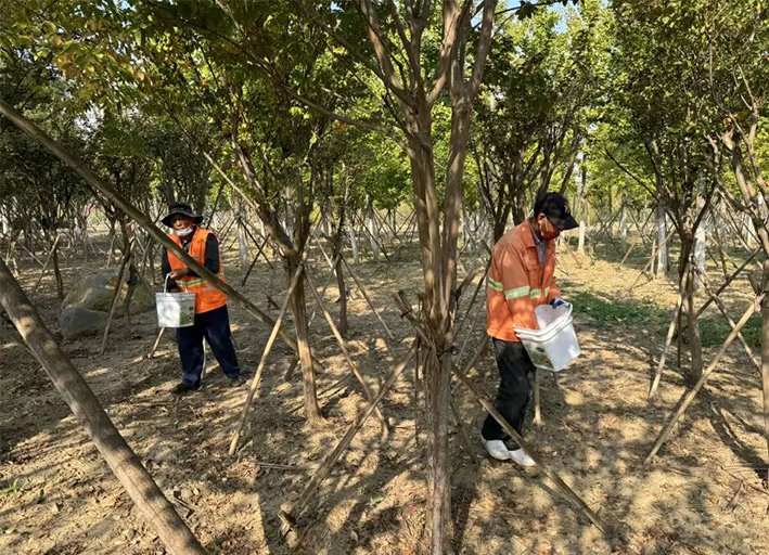自十月中下旬以來,班組全體成員積極準(zhǔn)備,做好抗旱保障工作。每天早晨7點(diǎn),兵分二路,按照各自分工迅速行動起來。葛承東帶領(lǐng)一部分工人對櫻花林、紅梅林整理樹圍;田恒亮帶領(lǐng)一部分工人施肥澆水,有的同志拎小提桶施肥,有的拿自來水管在后面澆水。為保證水流進(jìn)樹木根系,工作人員采取多種方法讓葉片、根系喝足水。為堅(jiān)決打贏這場抗旱保樹木攻堅(jiān)戰(zhàn),綠化分公司在堅(jiān)持科學(xué)用水、節(jié)約用水的前提下,通過科學(xué)的修剪植物、抹芽,松土,除草等措施確保苗木安全度過干旱天氣。由于抗旱工作啟動較早,措施得當(dāng),抗旱保苗工作已取得初步成效。目前為止,已經(jīng)完成7000余棵櫻花林和紅梅林的施肥、澆水工作。